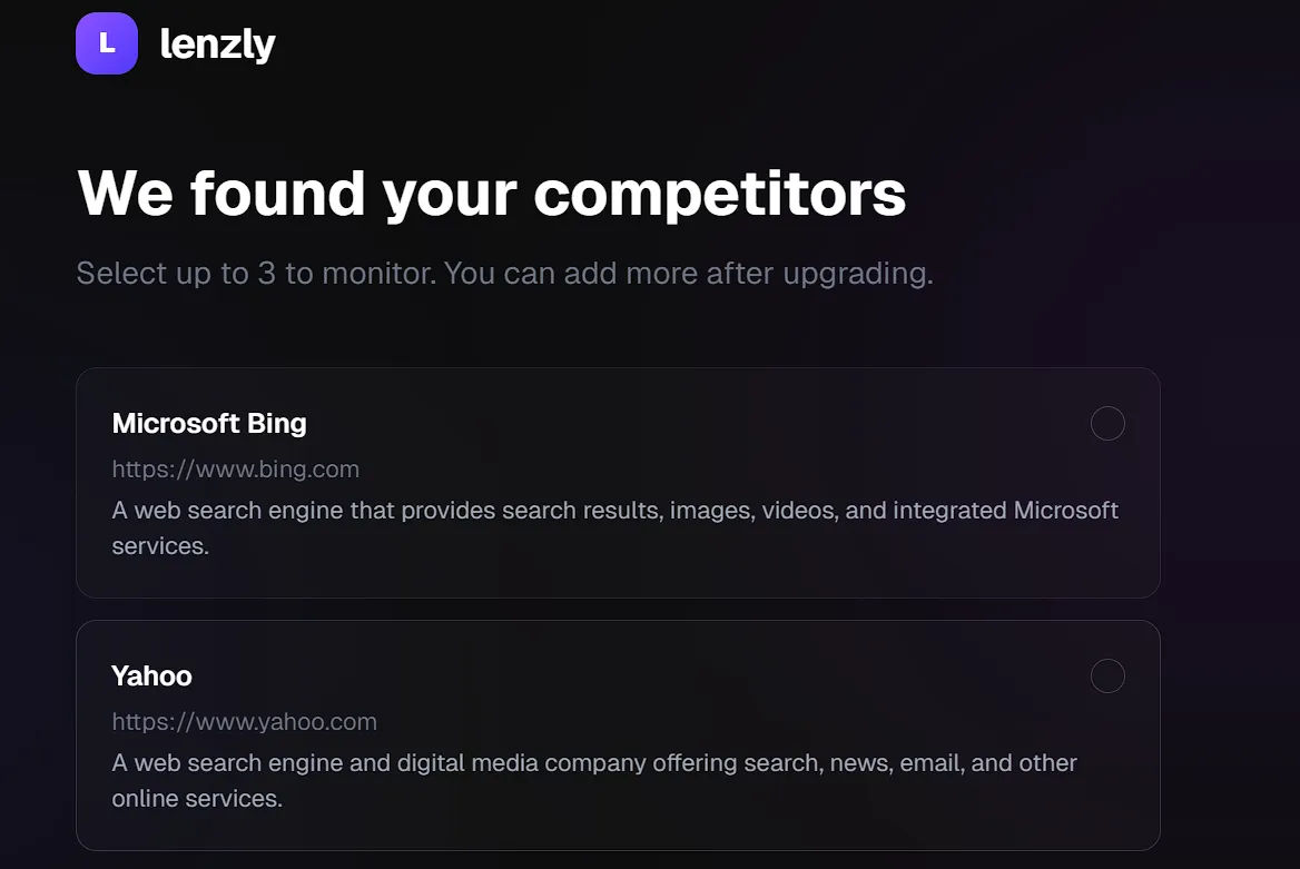 Lenzly's AI will scan your provided URL, analyze your industry, and present a curated list of businesses you are up against. For example, if you input a search engine, it will instantly pull up profiles for Microsoft Bing, Yahoo, Baidu, DuckDuckGo, and Yandex, complete with short descriptions of what they do.
