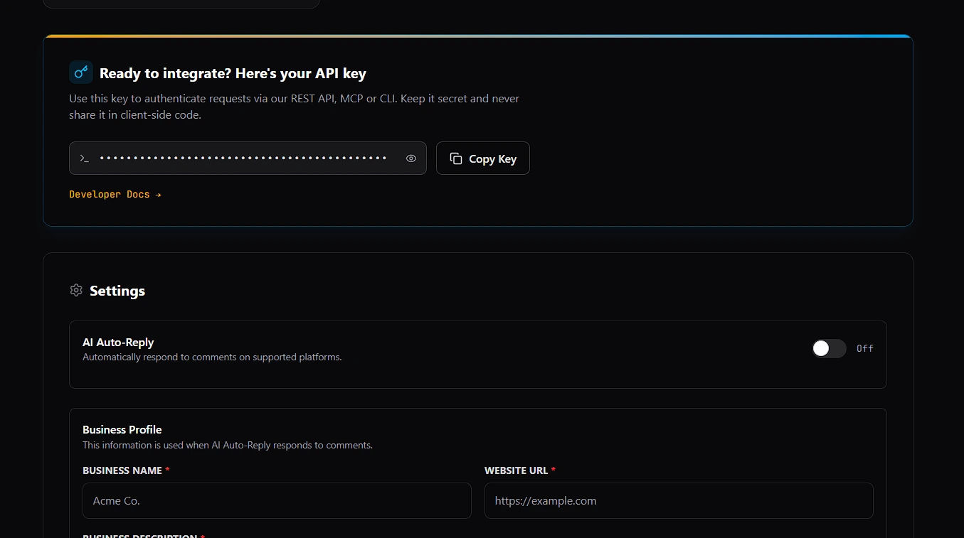 - AI Auto-Reply for Social Media Comments: Engaging with your community is critical for growth, but replying to every single comment takes forever. Premium users get access to the "AI Auto-Reply" setting, which is natively powered by OpenAI (ChatGPT). You can input your Business Profile (Name, URL, Description), and the ChatGPT-backed intelligence will automatically handle context-aware, natural-sounding replies to your audience, keeping your engagement rates high while you sleep.
