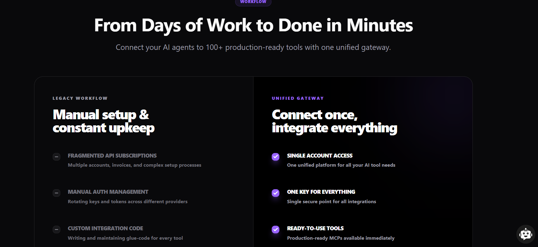 Over time this leads to complex architectures where developers maintain dozens of connectors and API clients. Every new tool adds another layer of work.