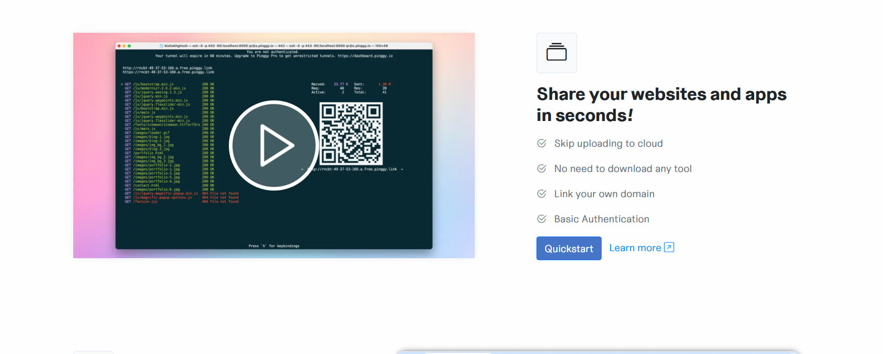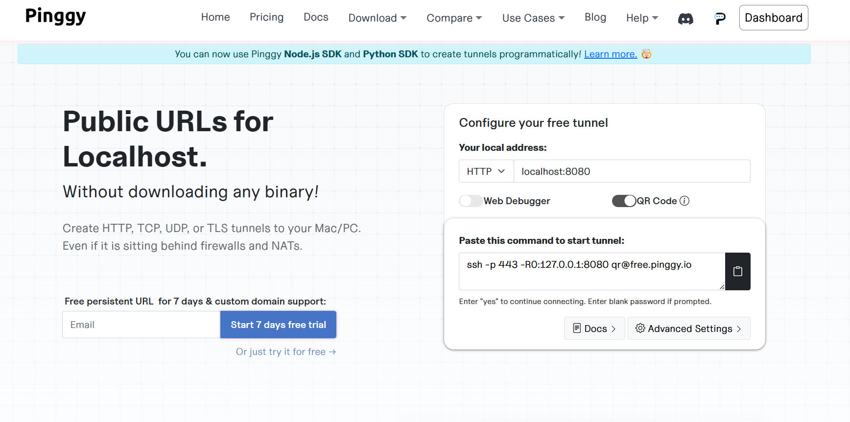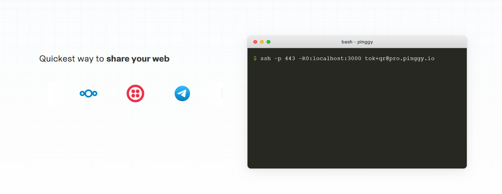 Pinggy takes a different route by simplifying the entire process. Instead of requiring downloads, the service can run directly from a terminal command using SSH tunneling.