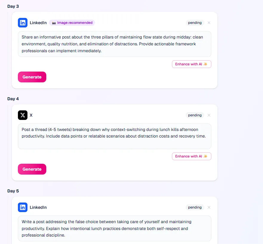 Generating the posts is only half the battle; pacing them out so you don't overwhelm your audience is the other. Remixify doesn’t stop at single posts. Its built-in Campaign Planner turns one idea into a full multi-day strategy.
