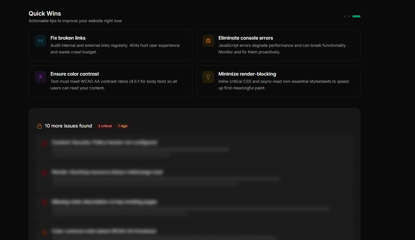 Instead of just giving you a bad score and leaving you feeling confused, WebScore creates a dedicated "Quick Wins" section. It gives you clear, plain-English instructions on what you need to fix right now to improve your score.