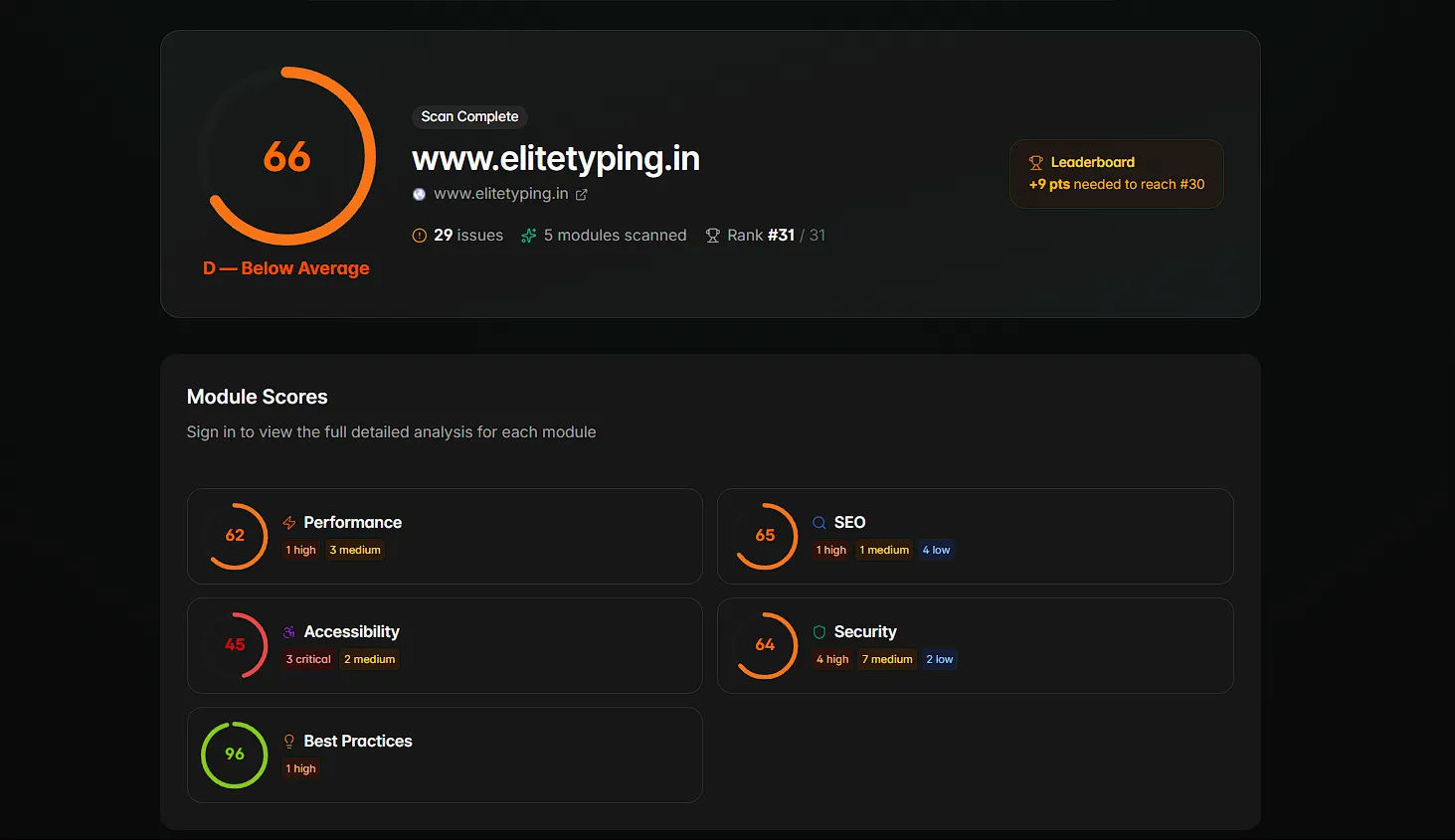 WebScore gave the EliteTyping site an overall score of 66 (a "D" grade) and found exactly 29 technical issues. The dashboard breaks these numbers down beautifully. We could instantly see that while the "Best Practices" score was an excellent 96, the "Accessibility" score was dragging the site down with a low 45.